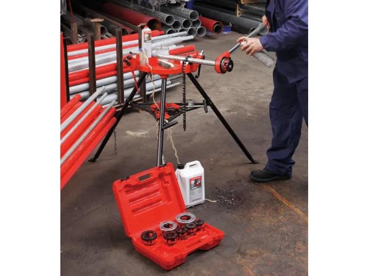 Instaladores de fontanería y calefacción utilizan la terraja manual para realizar uniones roscadas precisas y fiables de acuerdo con la norma EN 10226 (BSPT R) o ASME B1.20.1 (NPT) de Ø 1/2"- 11/4" en tubos de acero.
